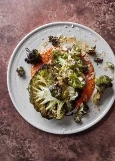 To serve, place the romesco sauce on the bottom of a plate, arrange the broccoli, including any little crispy bits, over the top and drizzle with the tahini dressing. I like to dress this with lightly toasted flaked almonds and a drizzle of the chilli oil.