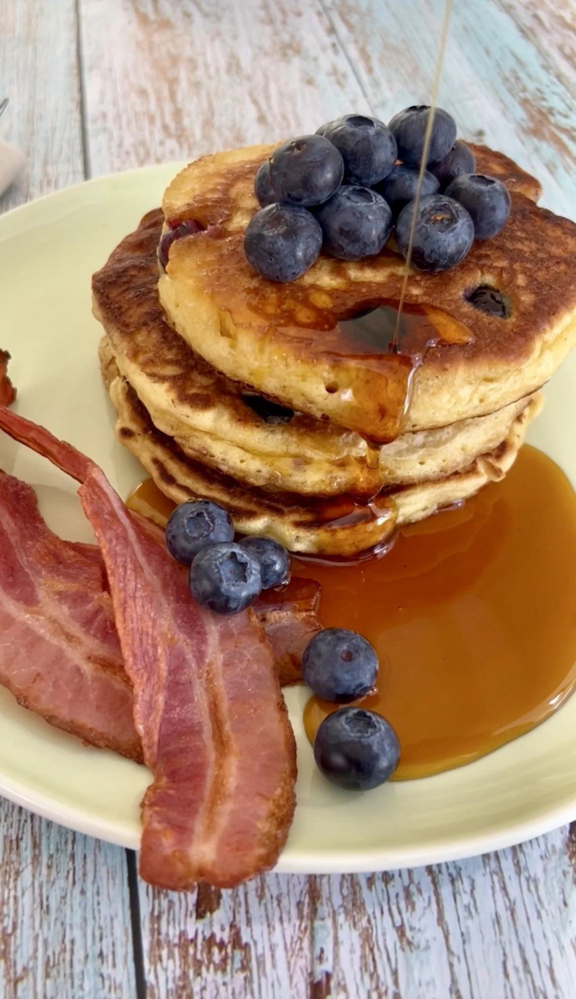 American Pancakes with Blueberries, Bacon & Maple Syrup