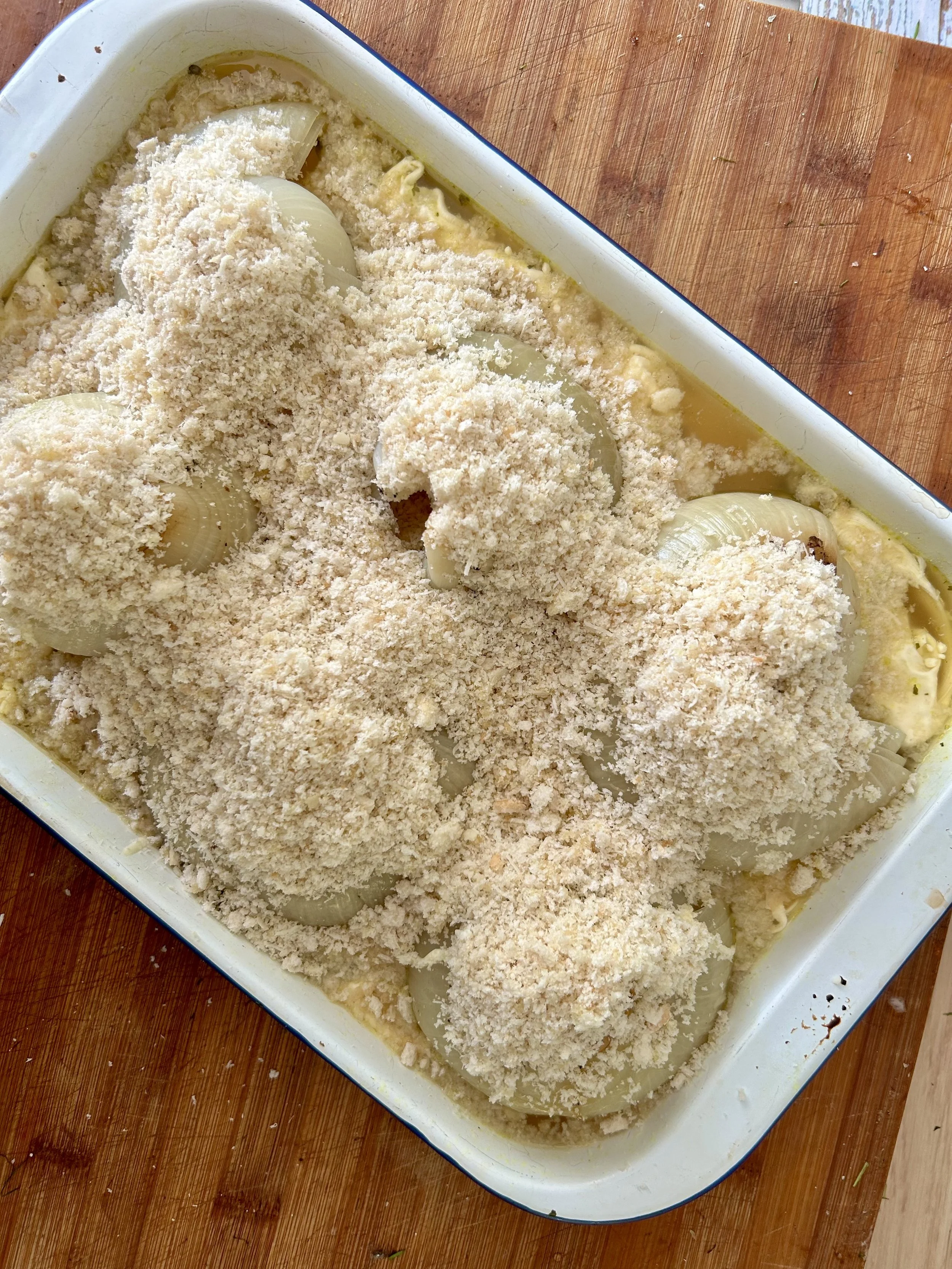 Place the onions under the grill for around 5 minutes until the breadcrumbs are a golden brown and the cream mixture is bubbling