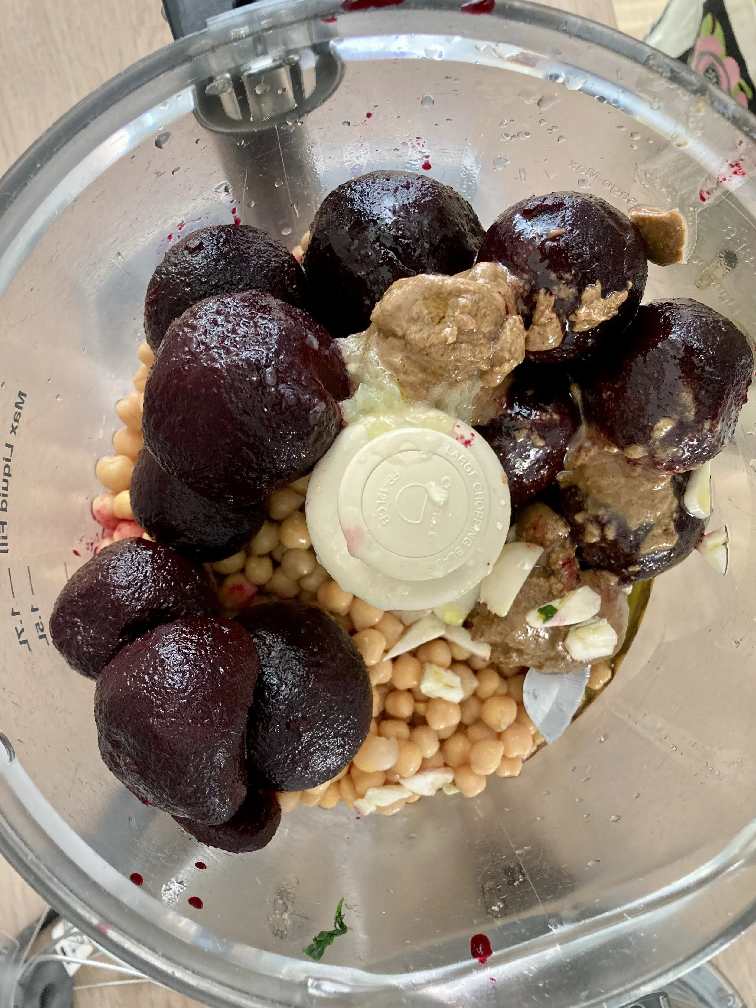 Place the chickpeas, beetroot, garlic, tahini, oil, sea salt and lemon juice