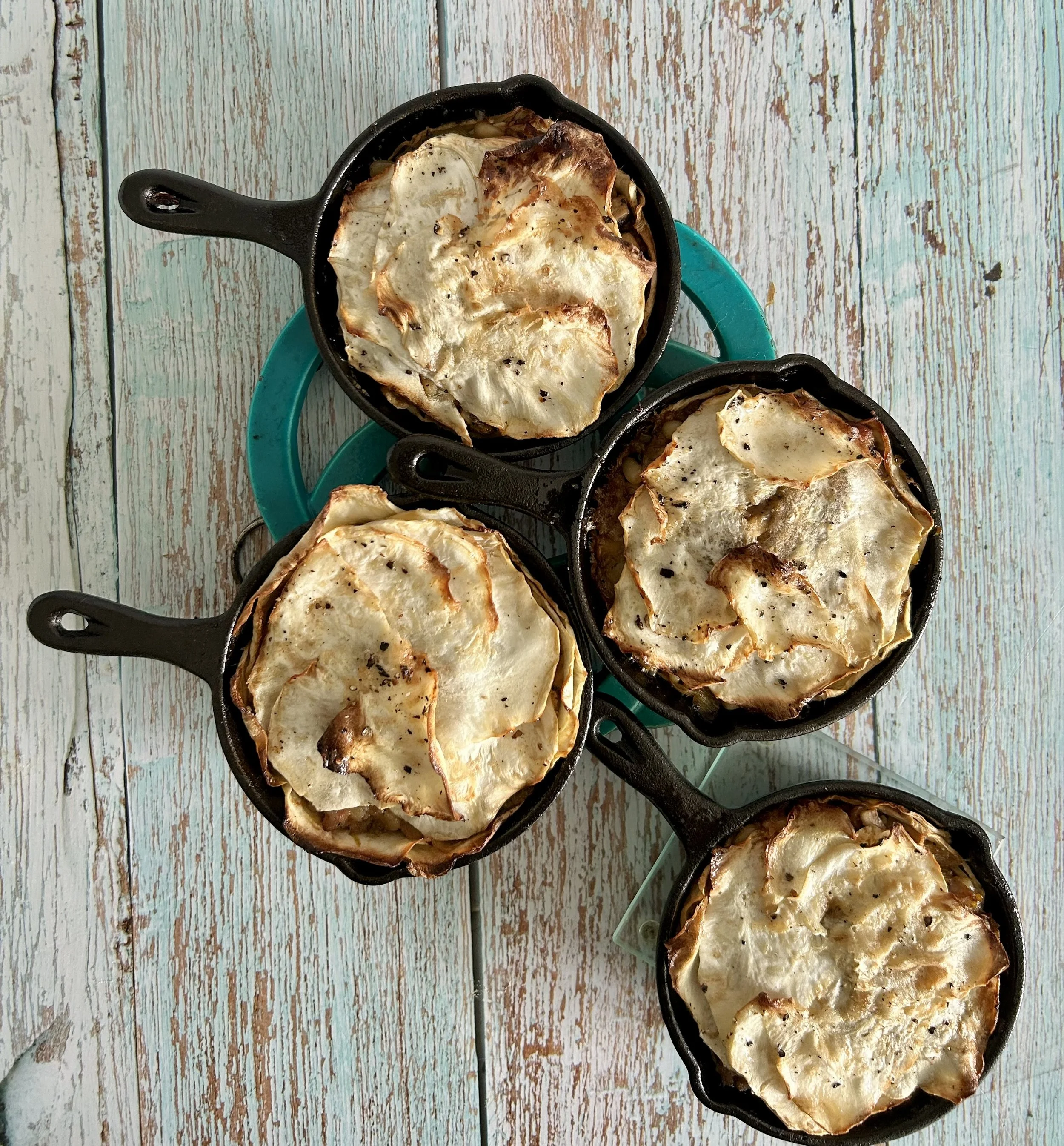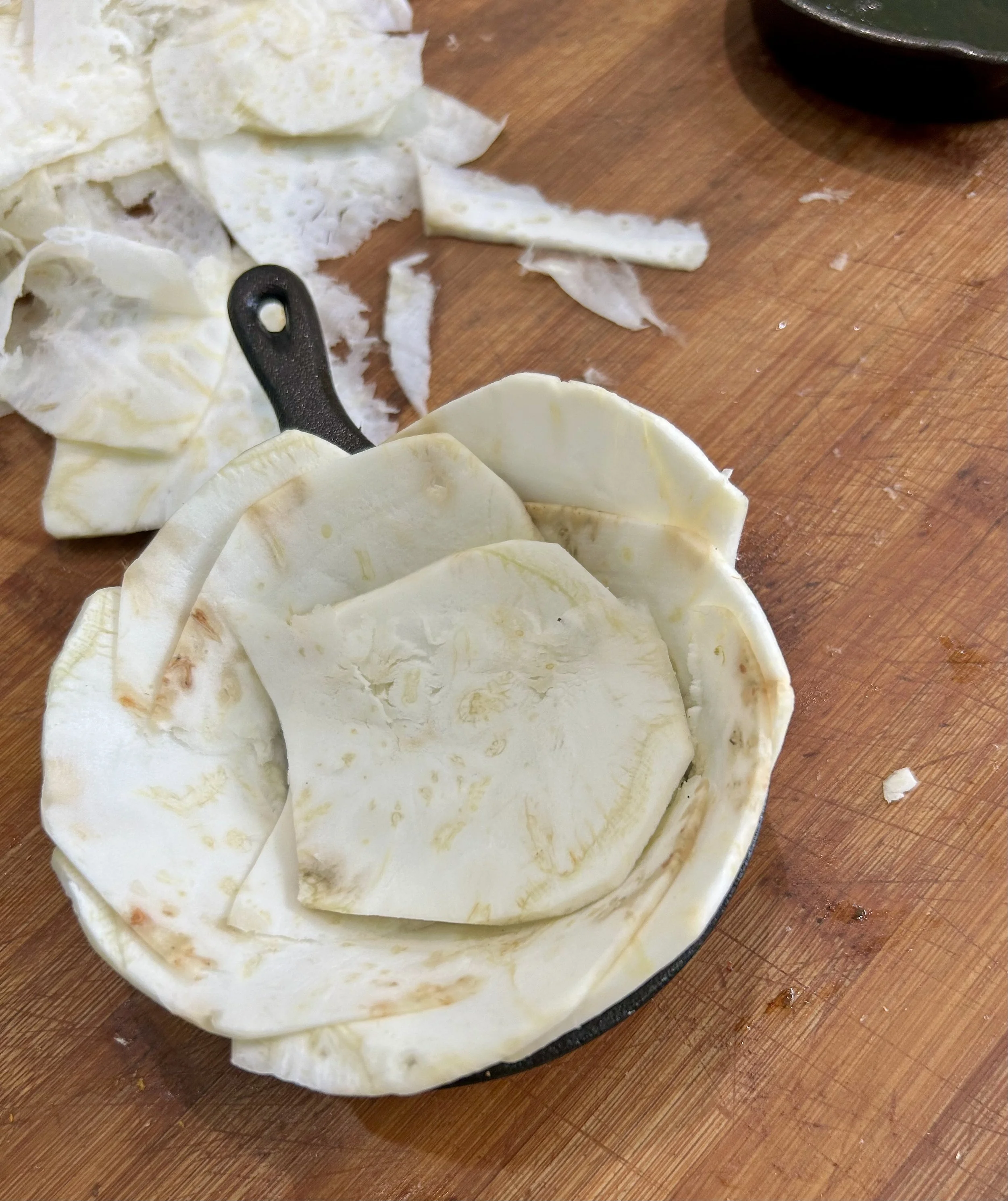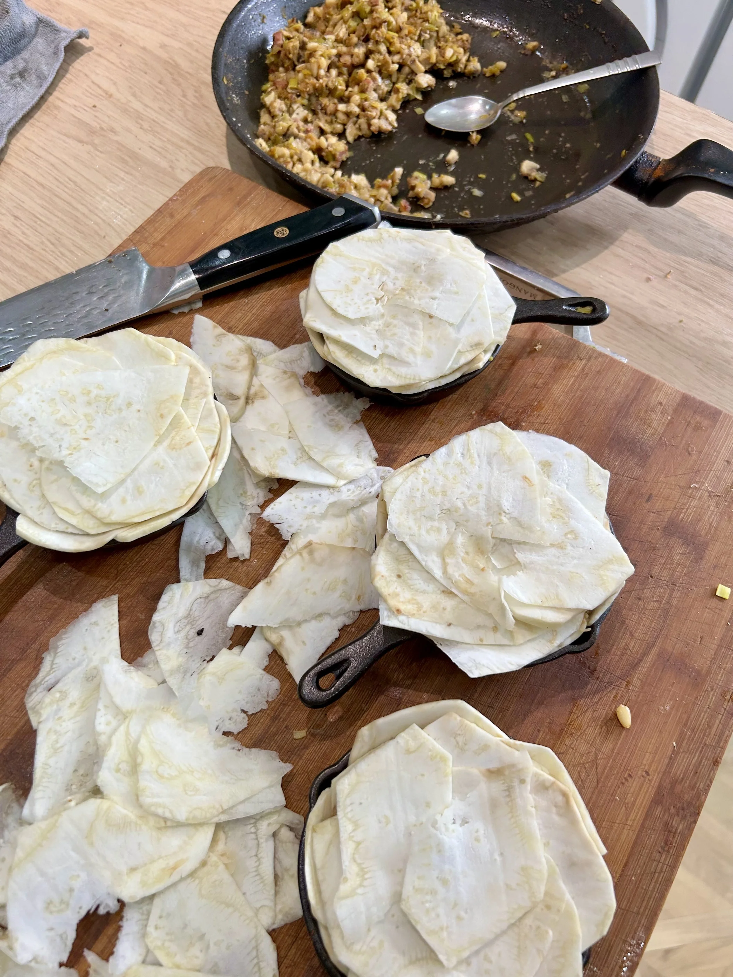 2) Slicing – The celeriac needs to be sliced really thin so that it will cook thoroughly and it need to be thin enough to bend around the skillet/pan.