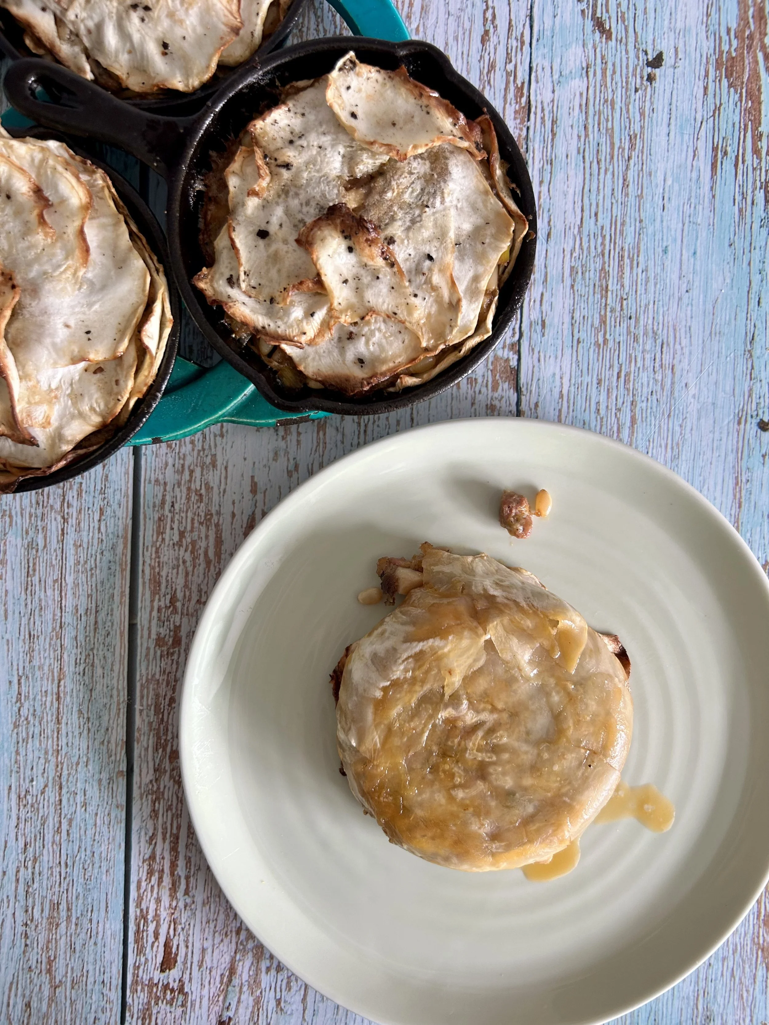 To serve, either take them to the table and eat from the skillet, or place a plate on the top of the skillet, and carefully turn out onto a serving plate.