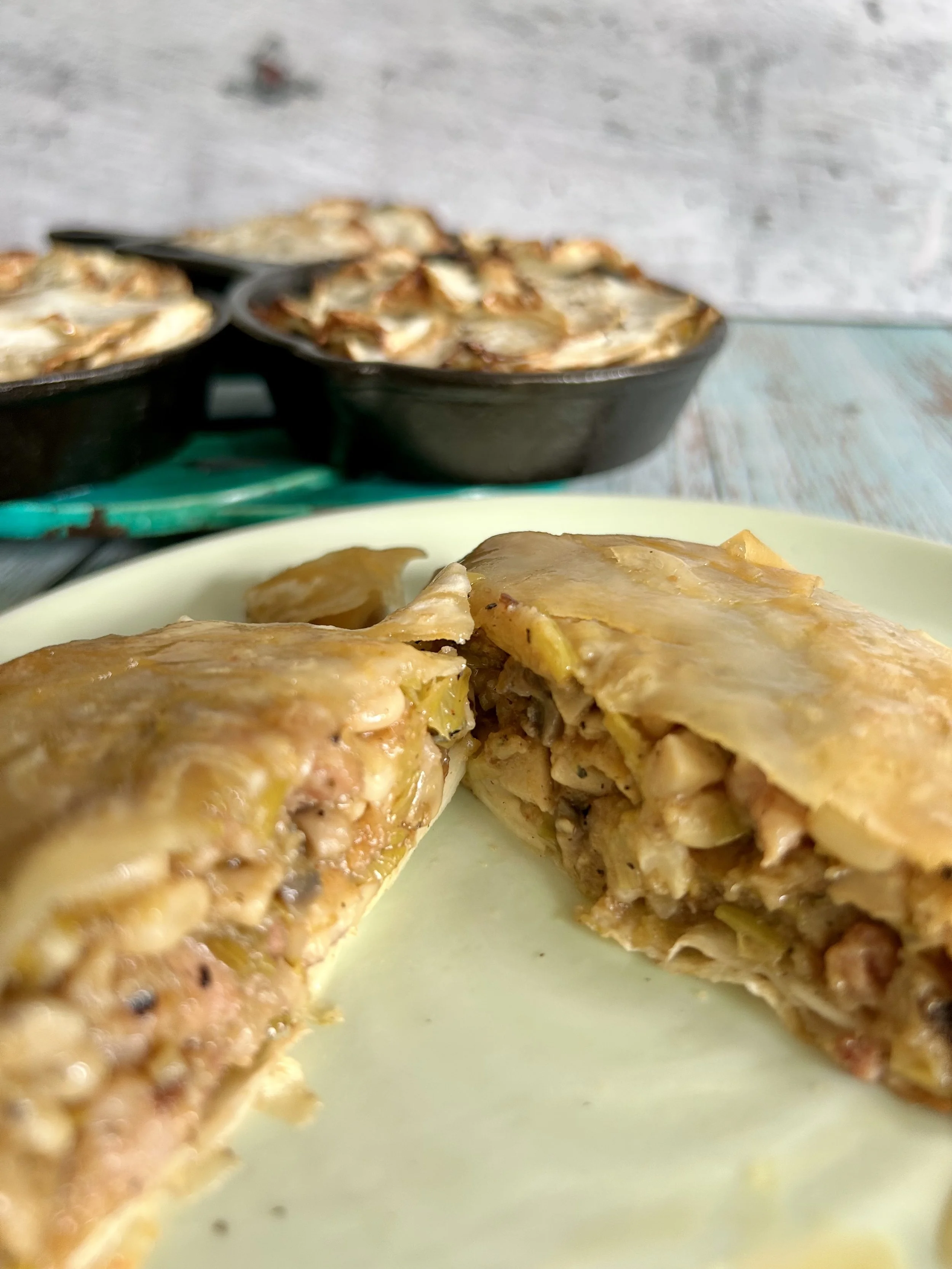 2) Chop Small – Chopping the mushrooms small is best, and also try to chop them the same size as the leaks. Doing this, will help them have the same mouthfeel when inside the torte.