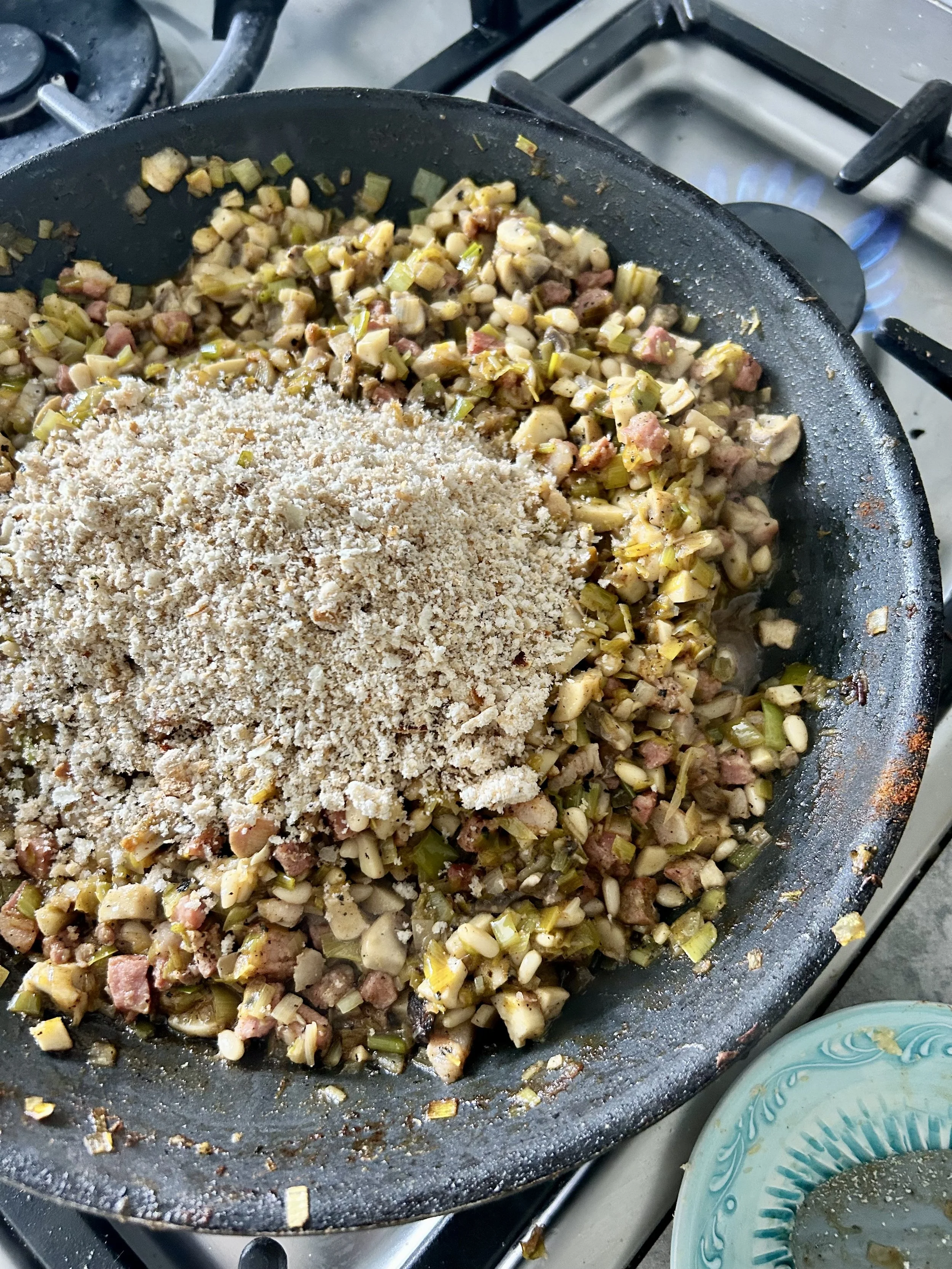 Keep cooking until most of the liquid has evaporated and then add the fresh breadcrumbs and the pine nuts.