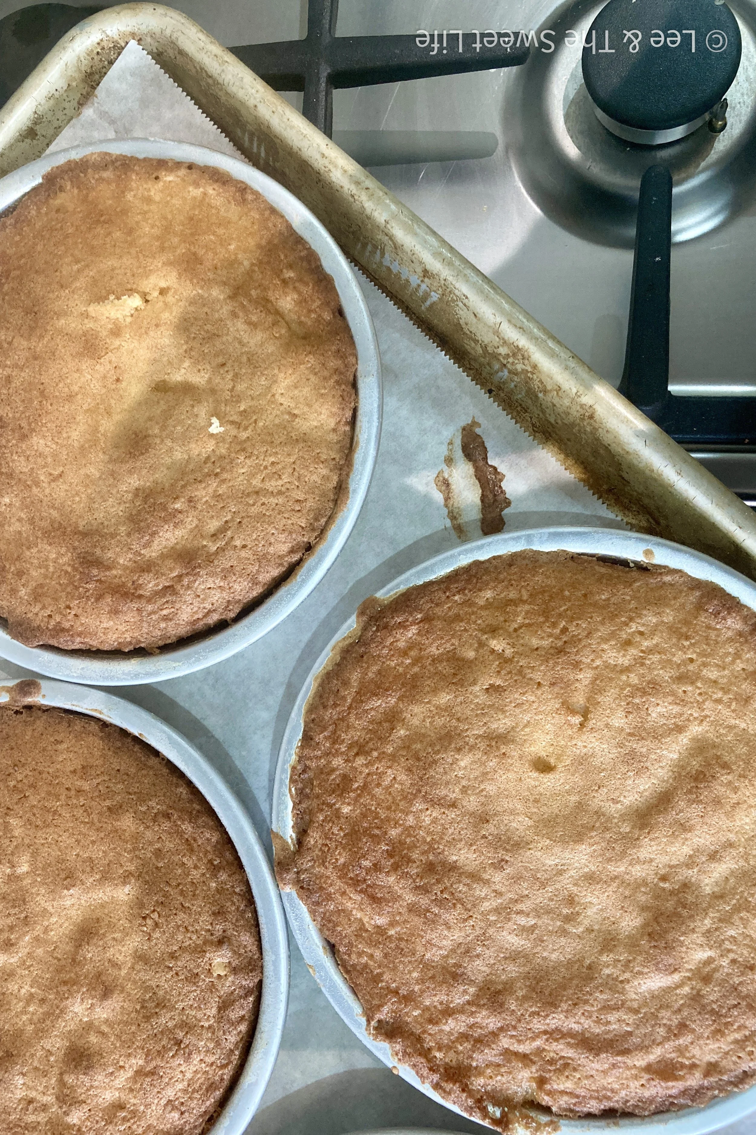 If using 2 thick 6” cake tins, once cooled, slice them in half to be left with 4 thin cakes.