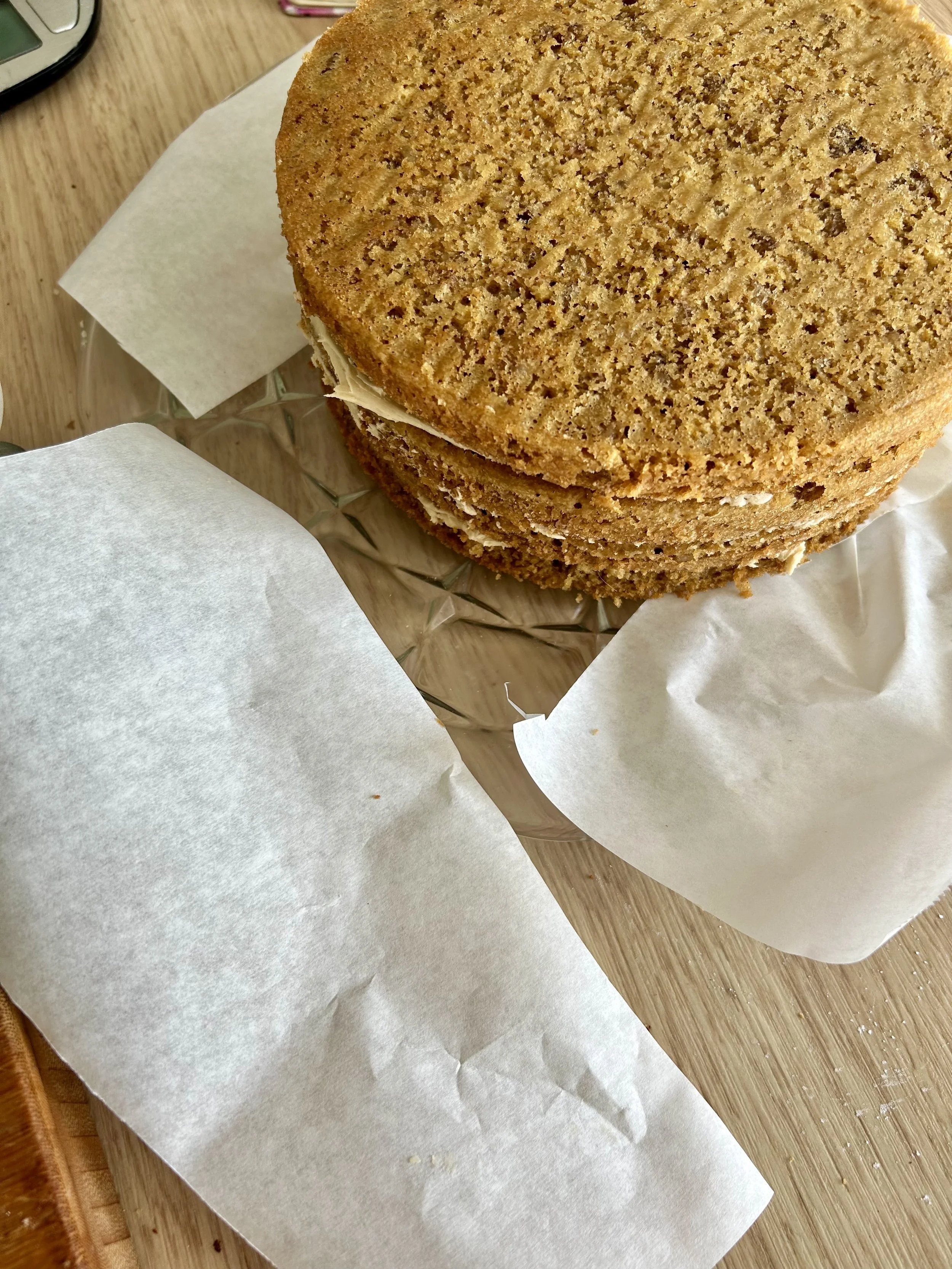 Remove another cake layer from it’s tin, and peel off the non-stick baking parchment.