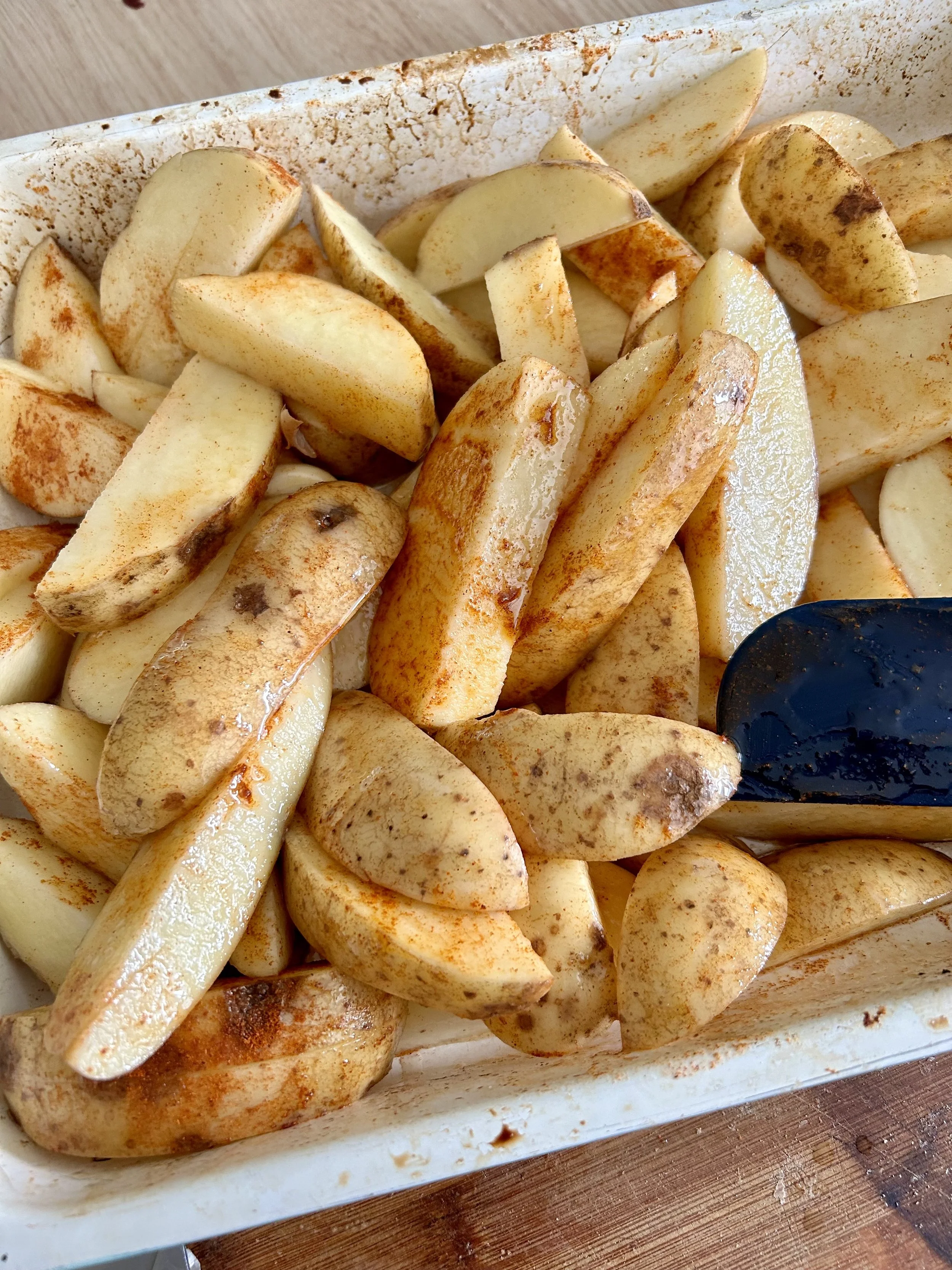 I make these potato wedges when I’ve a piece of meat in the oven which takes a few long hours to cook, because it takes hours to make these potatoes just how I like them.