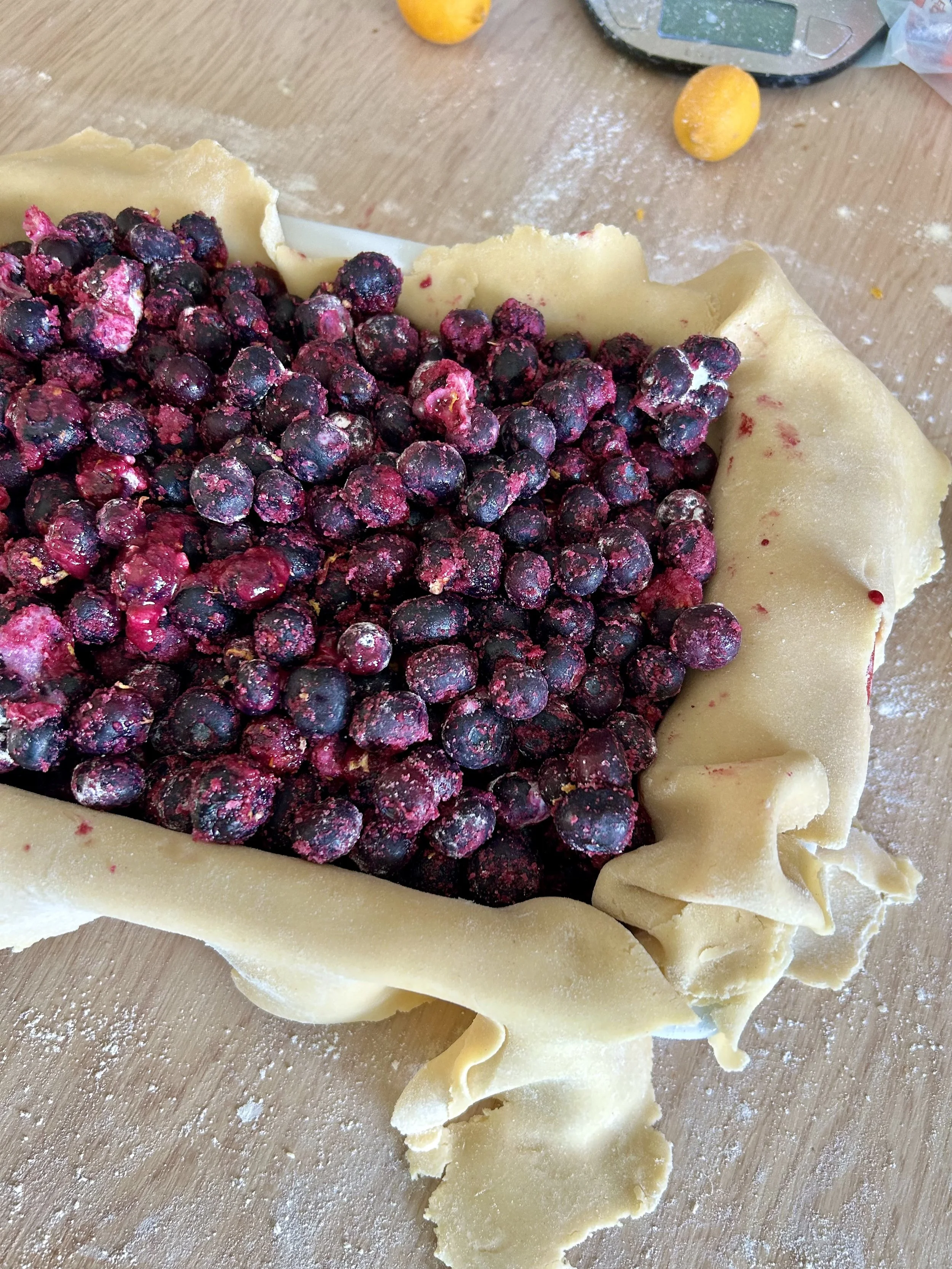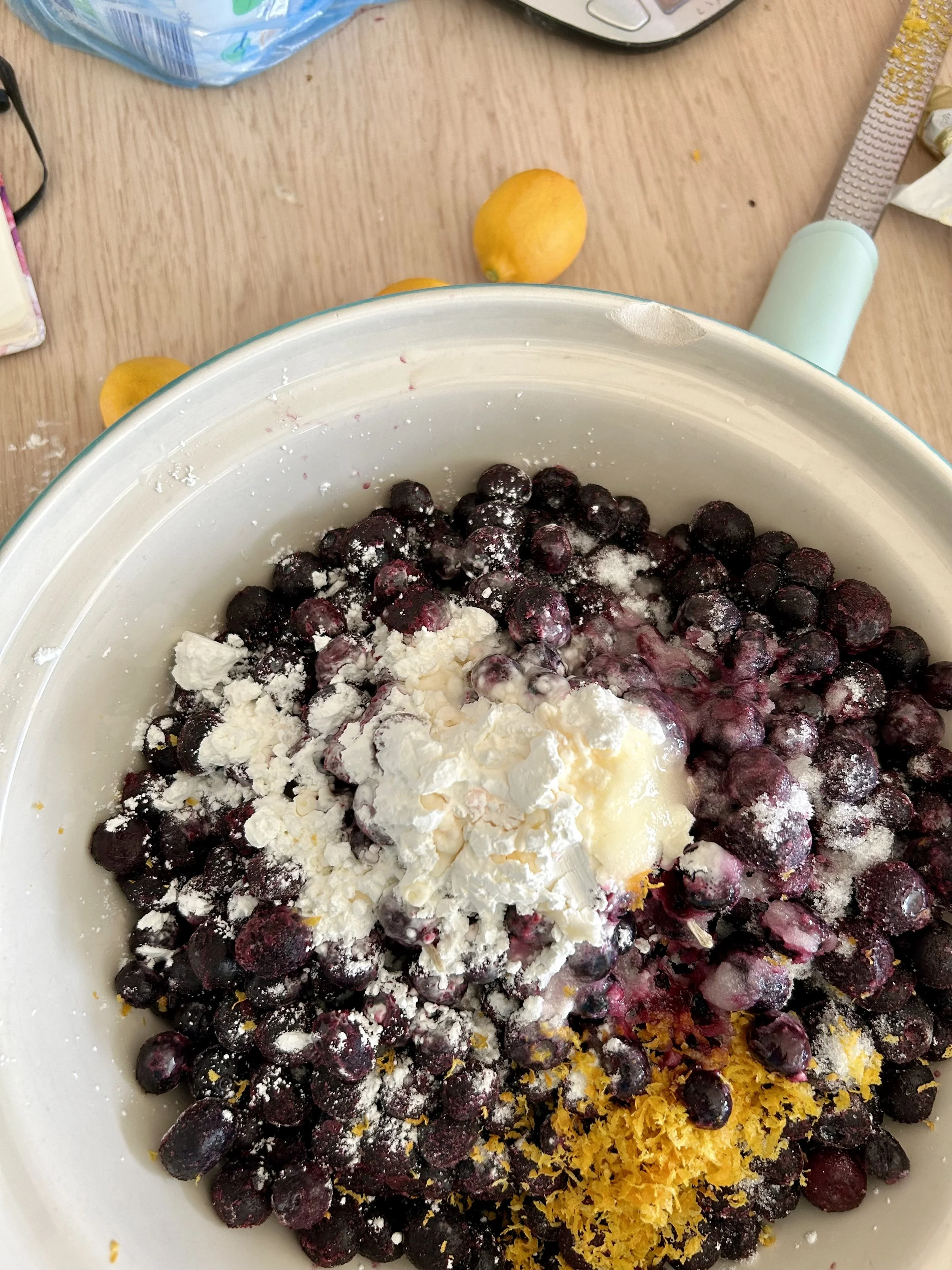 Cornflour, lemon zest and juice along with sugar added to the frozen blueberries.
