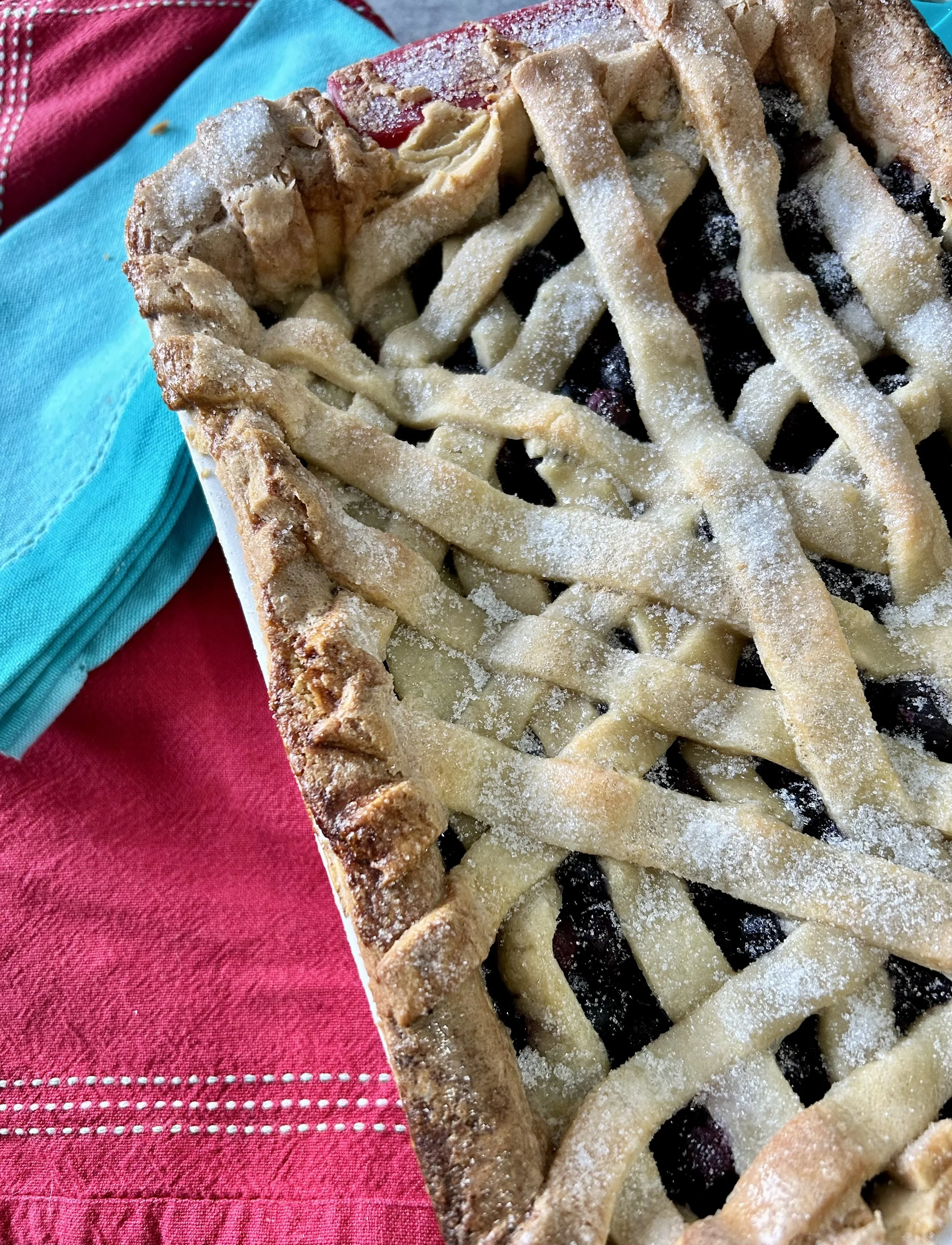 It’s a pie for a family, deep with fruit and soaking with thick sauce, not too sweet, enclosed in a pastry that glistens with sugar.