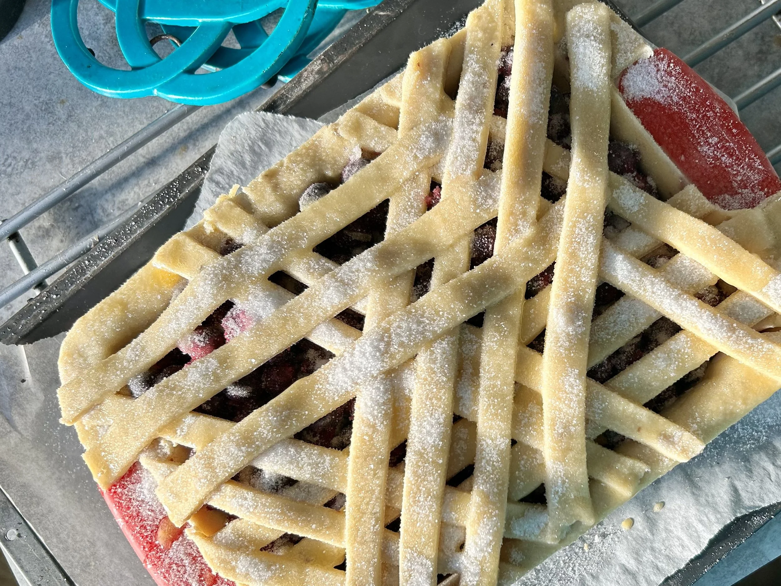 Sprinkle 100g of granulated sugar over the top of the lattice top.