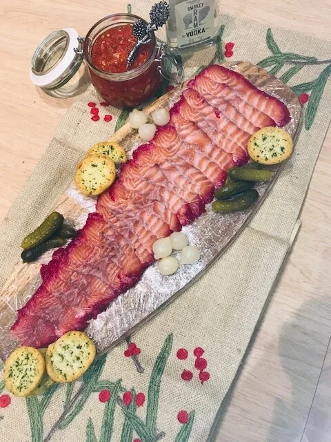 Somewhere on these recipe pages, there is another recipe for gravlax with a Beetroot, Vodka and Pink Peppercorn cure (find it here)