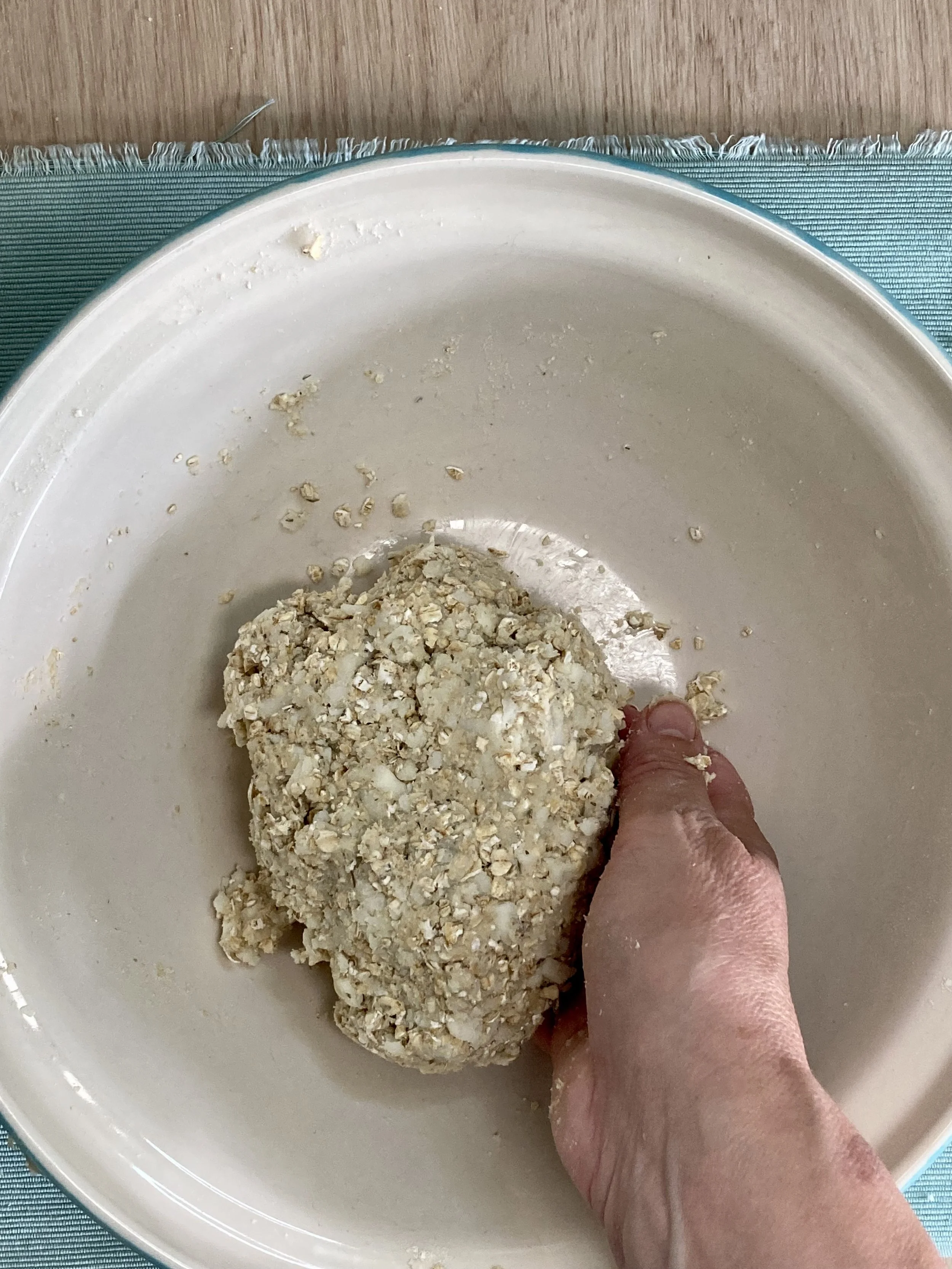 Pour the honey mixture over the dry mixture and use the fork to bring together the oat mixture into a rough dough