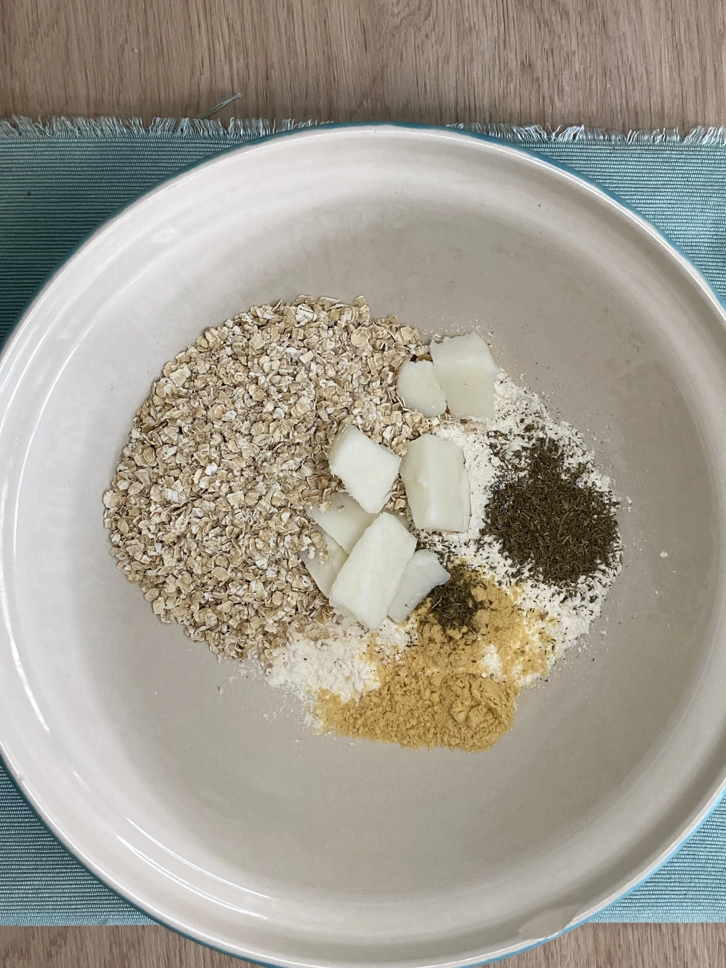Place the oats, flour, mustard powder, thyme and salt and pepper into a bowl