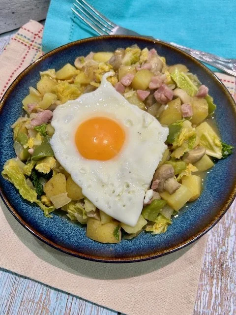 There’s nothing to dislike about this dish, its potatoes, bacon and onion and garlic with one of my favourite green vegetables cut into it.