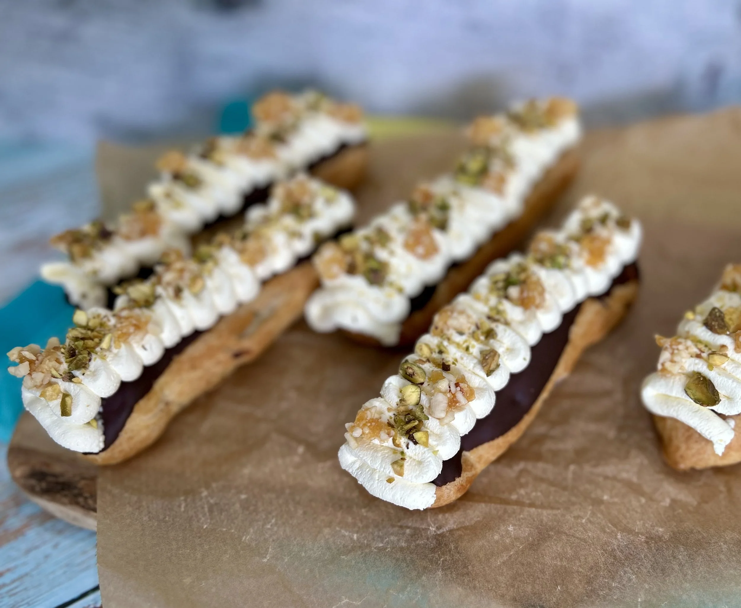 Home Made Eclairs with Pistachio Pastry Crème & Peanut Brittle