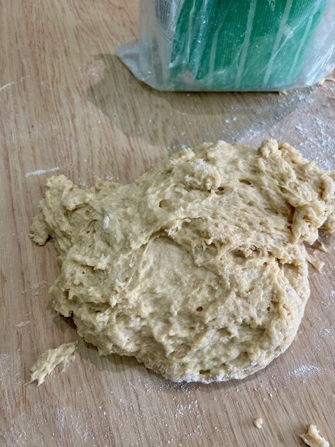 Use your hands to bring the dough together and start to knead the dough by stretching it and then bringing it back together.