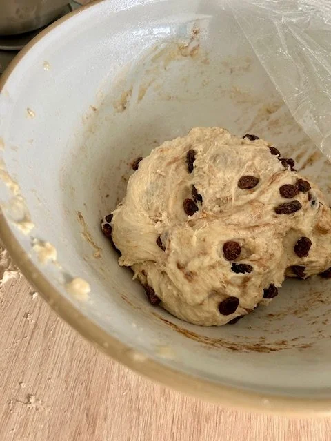 Add the orange zest, sultanas, mixed peel, cinnamon, and the mixed spice to the dough in the bowl and stretch and fold it until all the fruit and spices are mixed in really well.