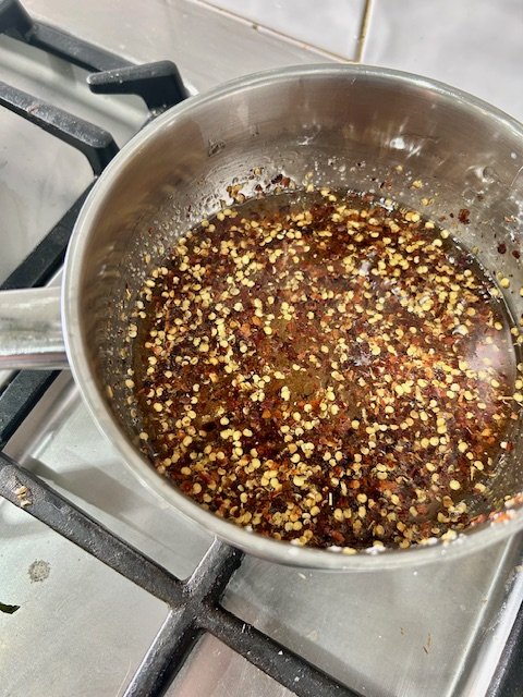 Let it simmer on a gentle heat for 2 minutes, so the chilli flakes soften.