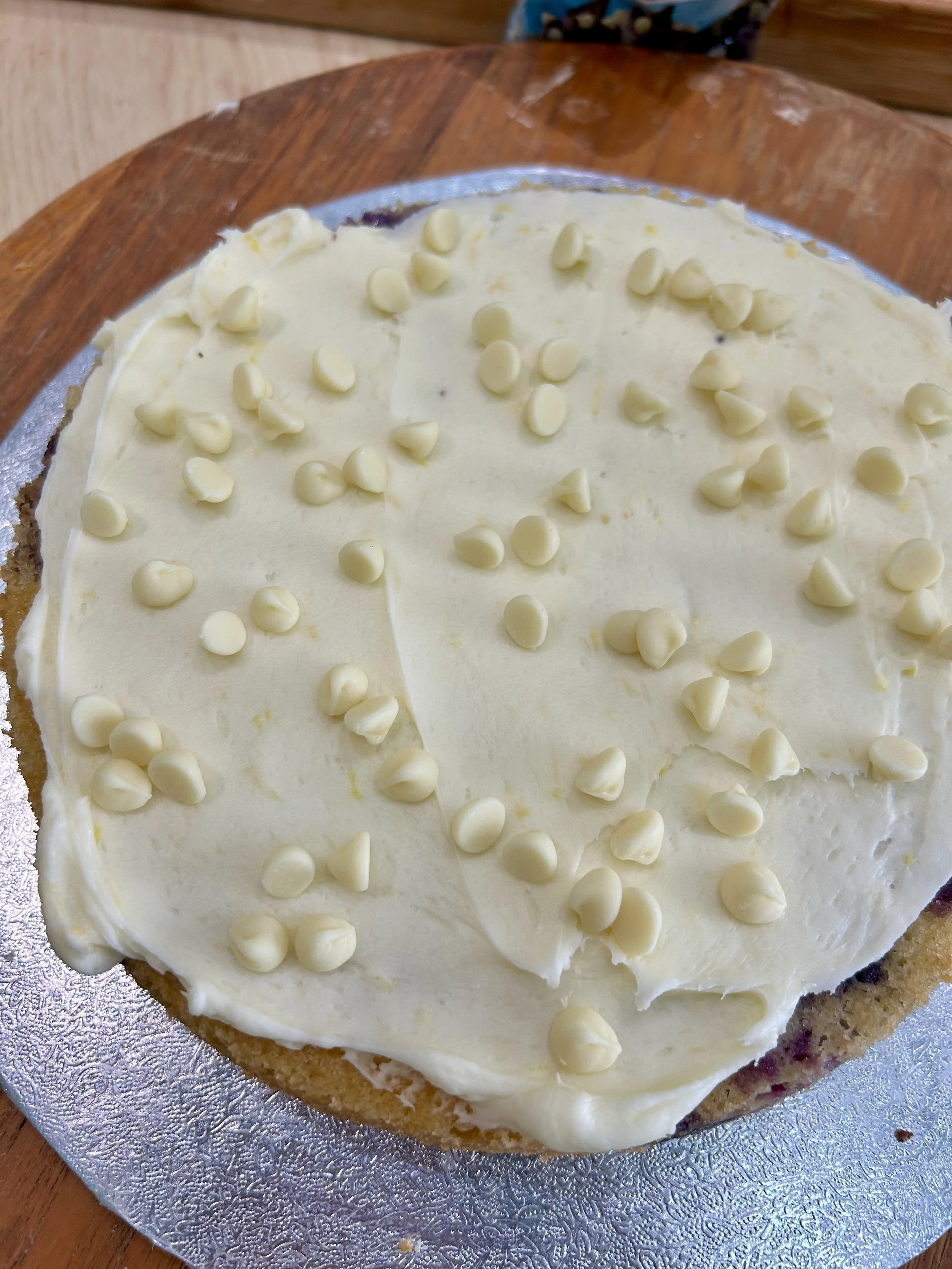 Lemon & Blueberry Layer Cake with Lemon Cream Cheese Butter Cream & White Chocolate Chips.