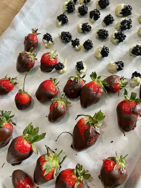 Let the melted chocolate cool for a minute, and then dip the bottom half of the blackberries in the white chocolate and the bottom half of the strawberries in the dark chocolate, laying them on sheets of non-stick parchment paper to set up and get cold.