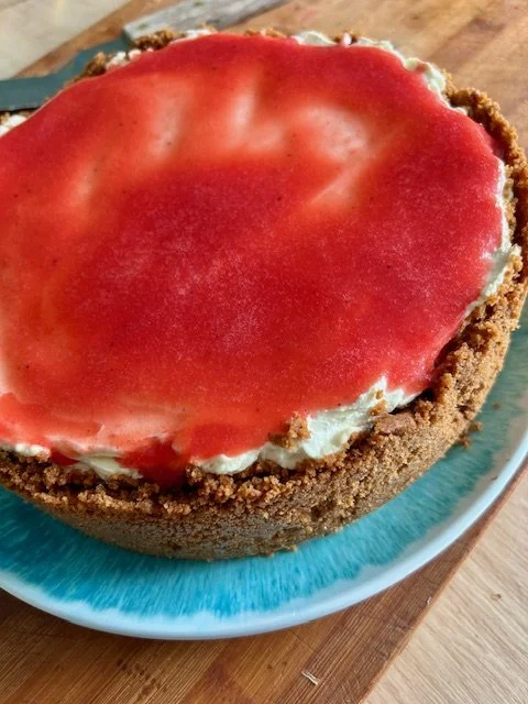 When ready to eat the cheesecake, pour some of the coolie over the top. Try to keep the coolie just on the cheesecake mixture