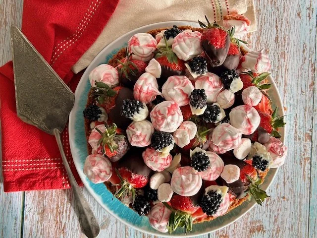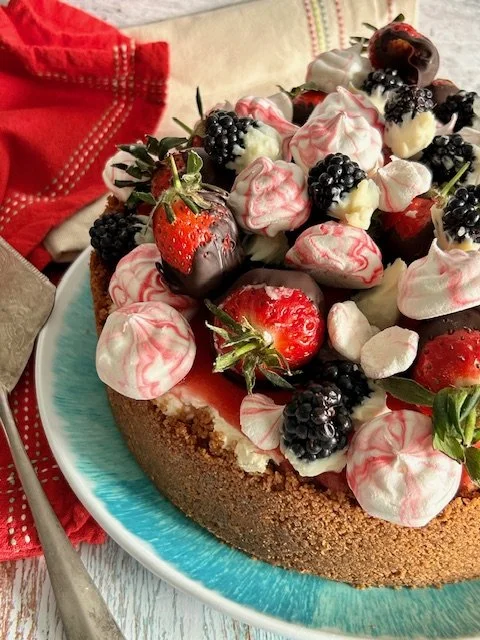 A deep filled cheesecake topped with a layer of fresh strawberry coolie and then tons of fresh, chocolate dipped, strawberries and blackberries. If that’s not enough to excite my sweet toothed families tastebuds, add all those pretty stripped meringues into the spaces left behind.