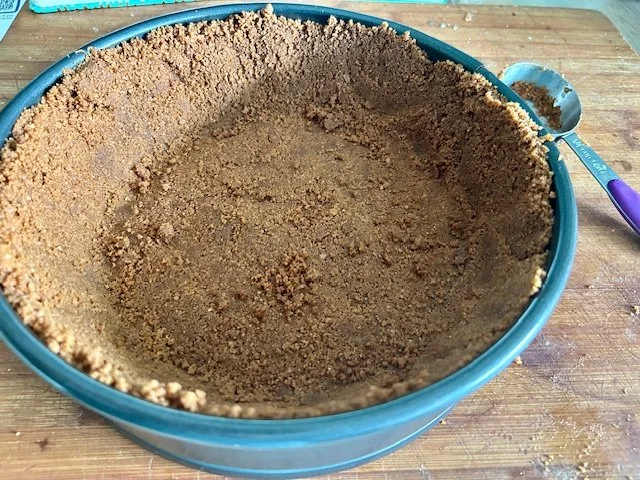Put the crumb mixture into the prepared tin, and using the back of a small cup, compress the crumbs up the sides of the tin and on the bottom.