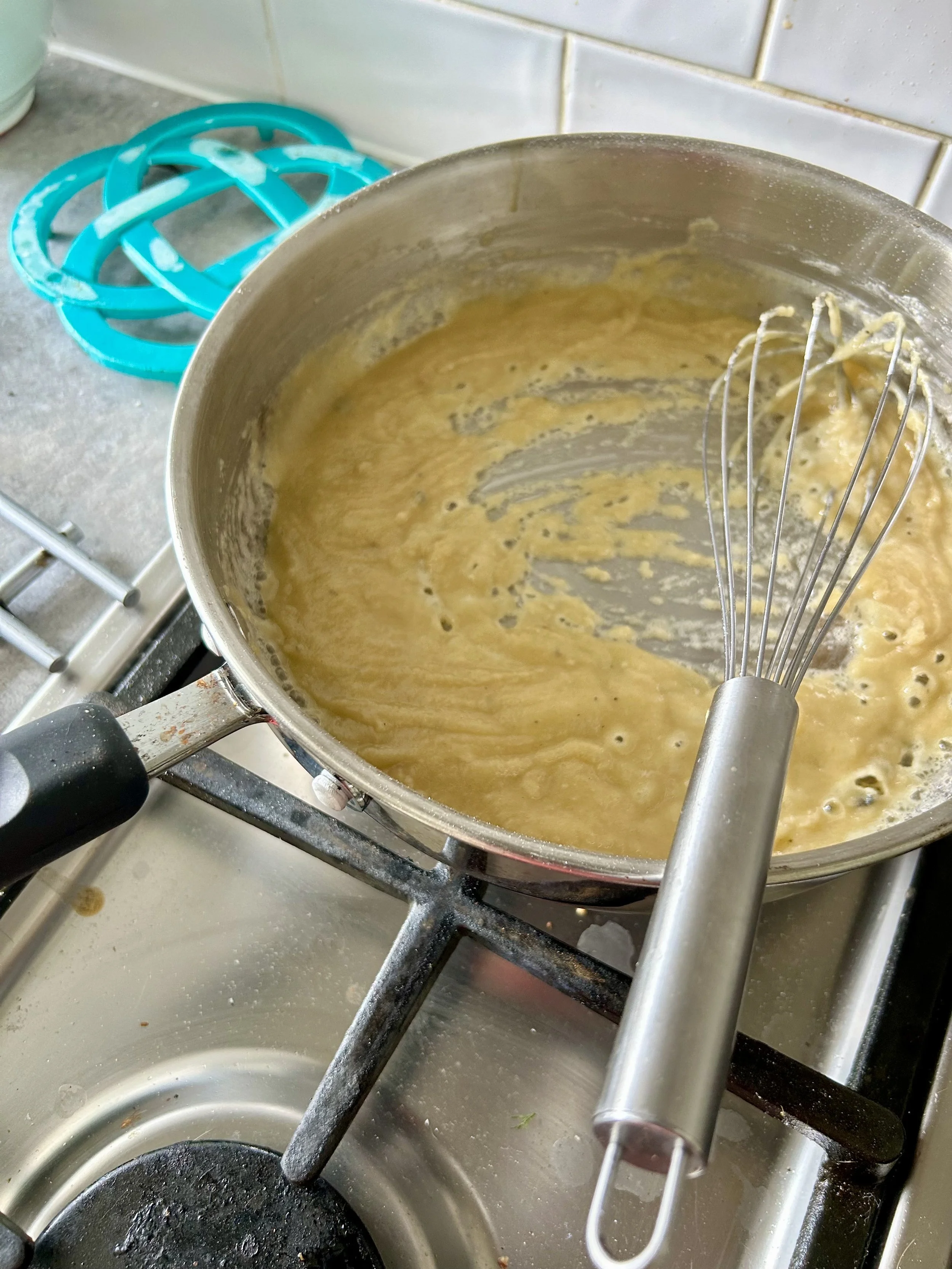 Add the hot stock to the roux and whisk over a low heat until it goes smooth.