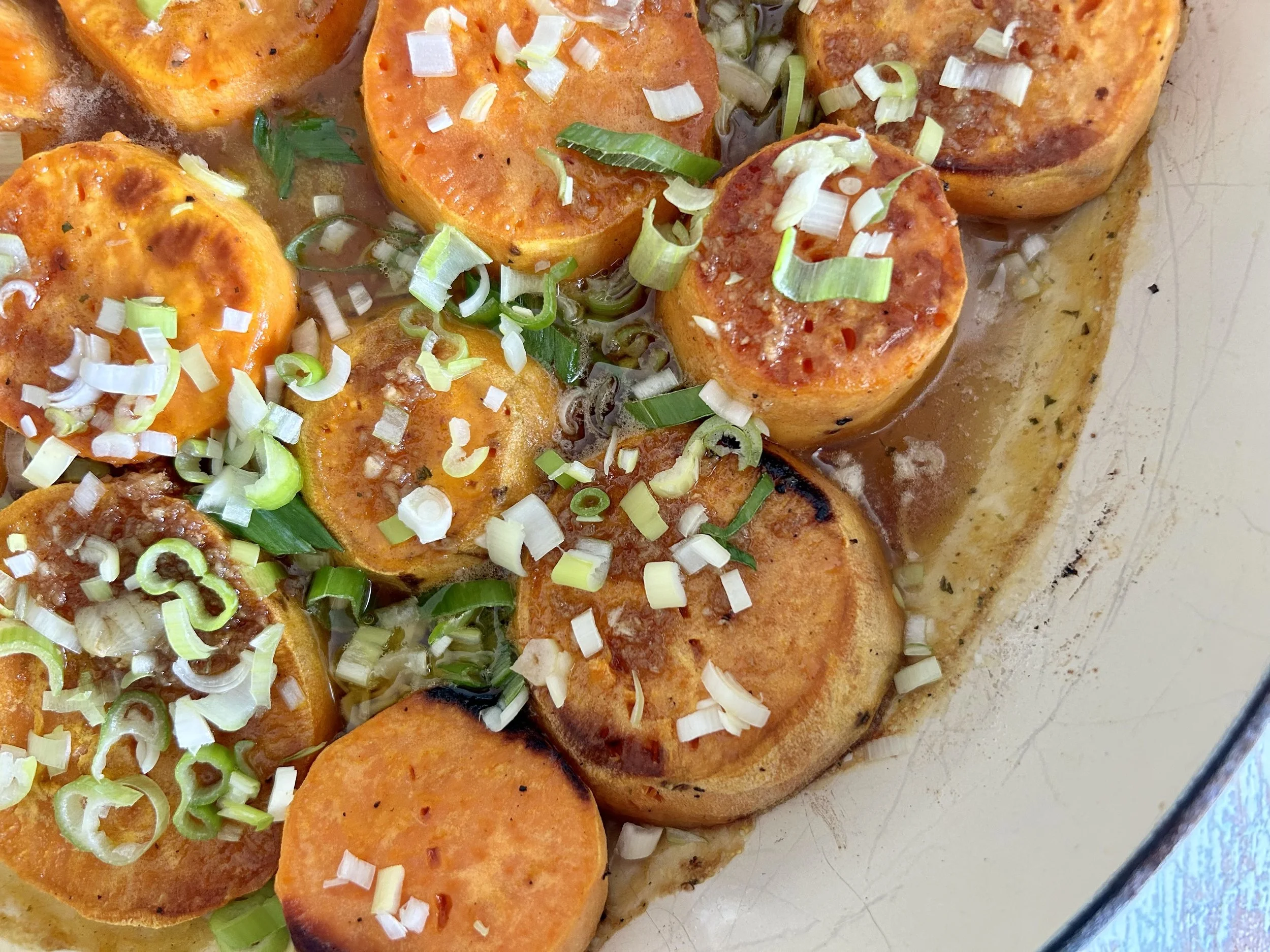 This sweet potato dish is deep with flavour from the chicken stock and rich with flavour from the garlic brown butter, resulting in potatoes that melt into a soft and delicious side dish.
