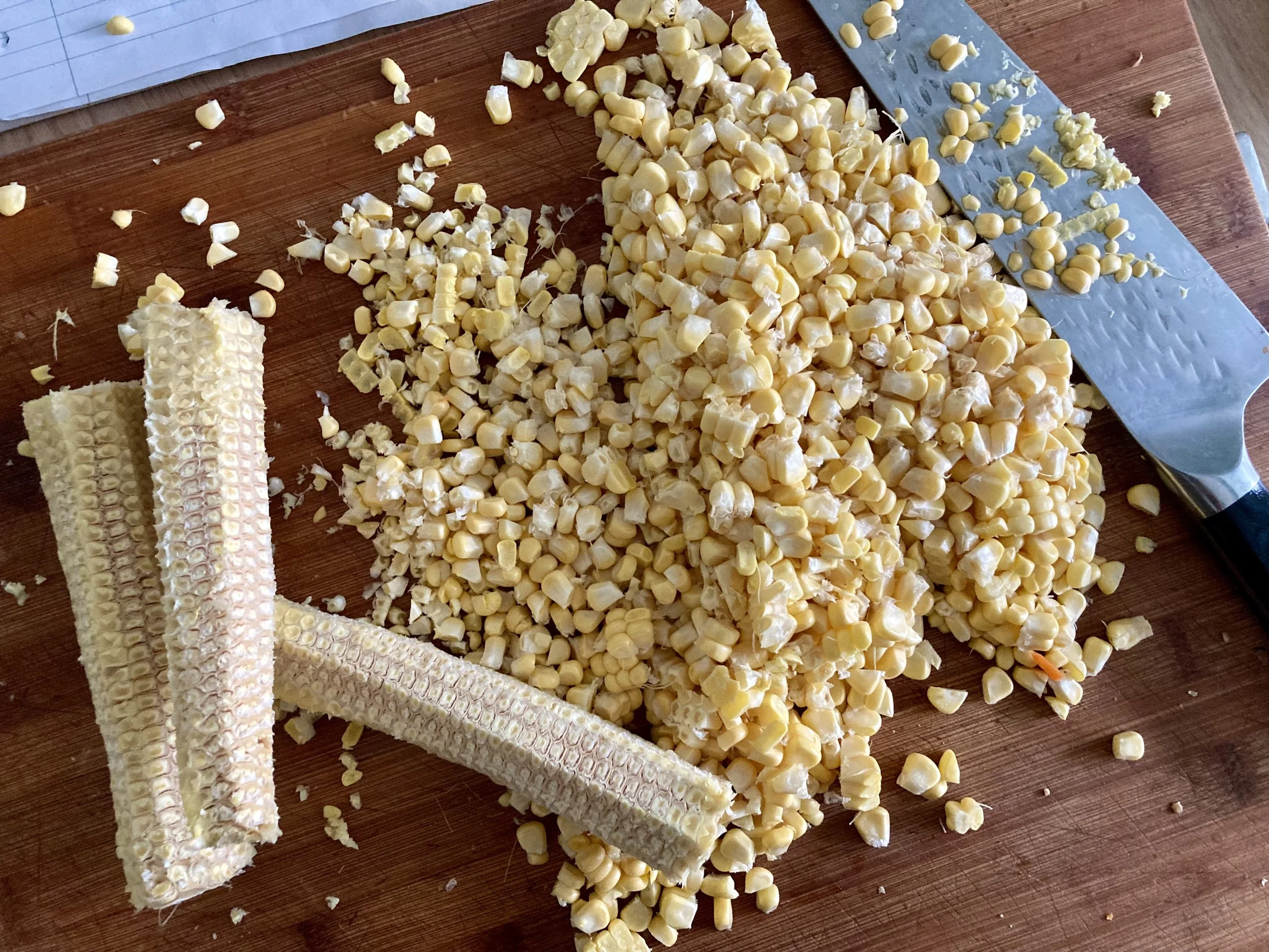 2) When stripping the corn from the cob, make sure to scrap the knife down the husk to capture all of the corn milk.