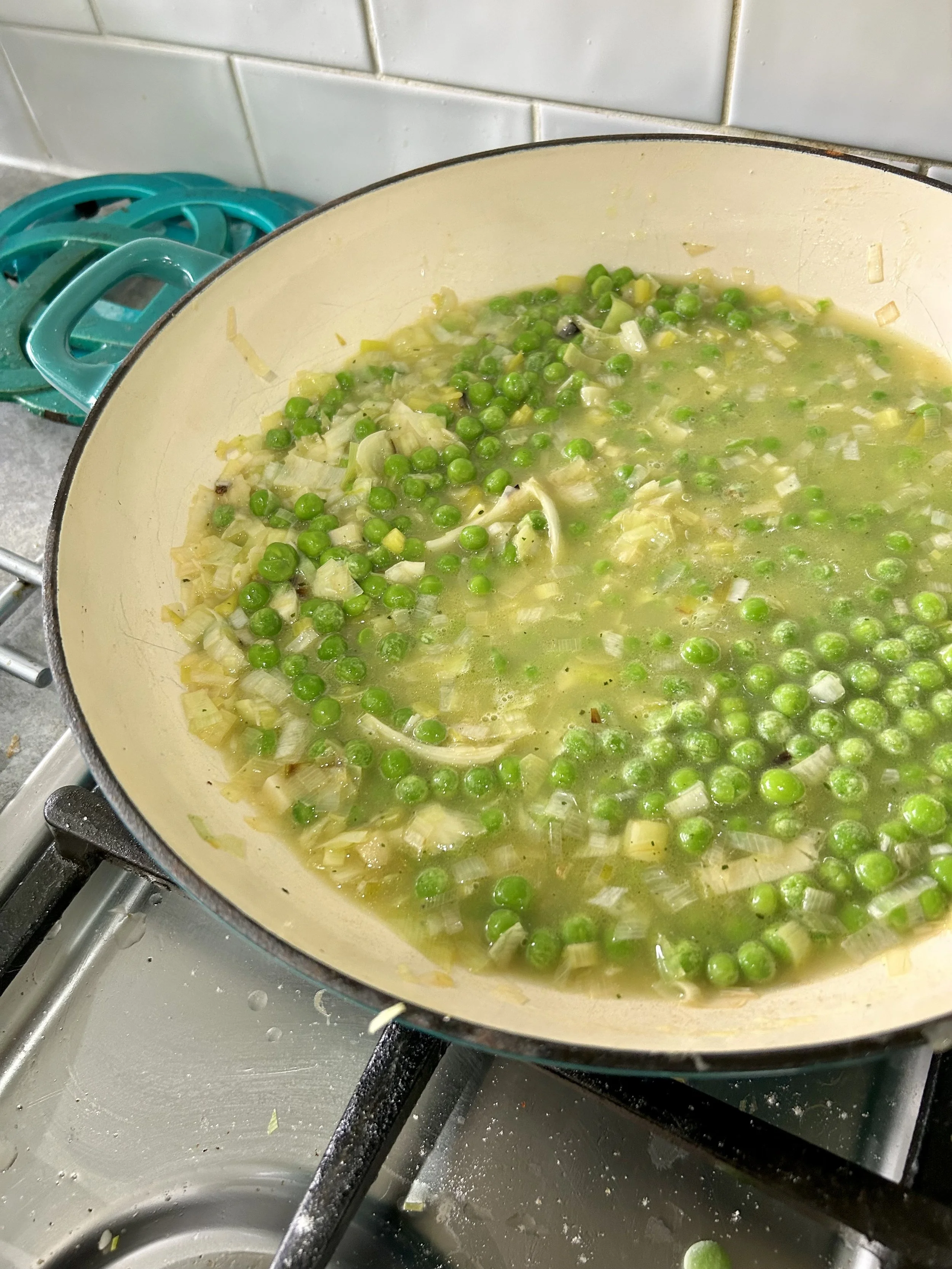Add the frozen peas and the hot stock to the pan, and bring it to a gentle simmer.