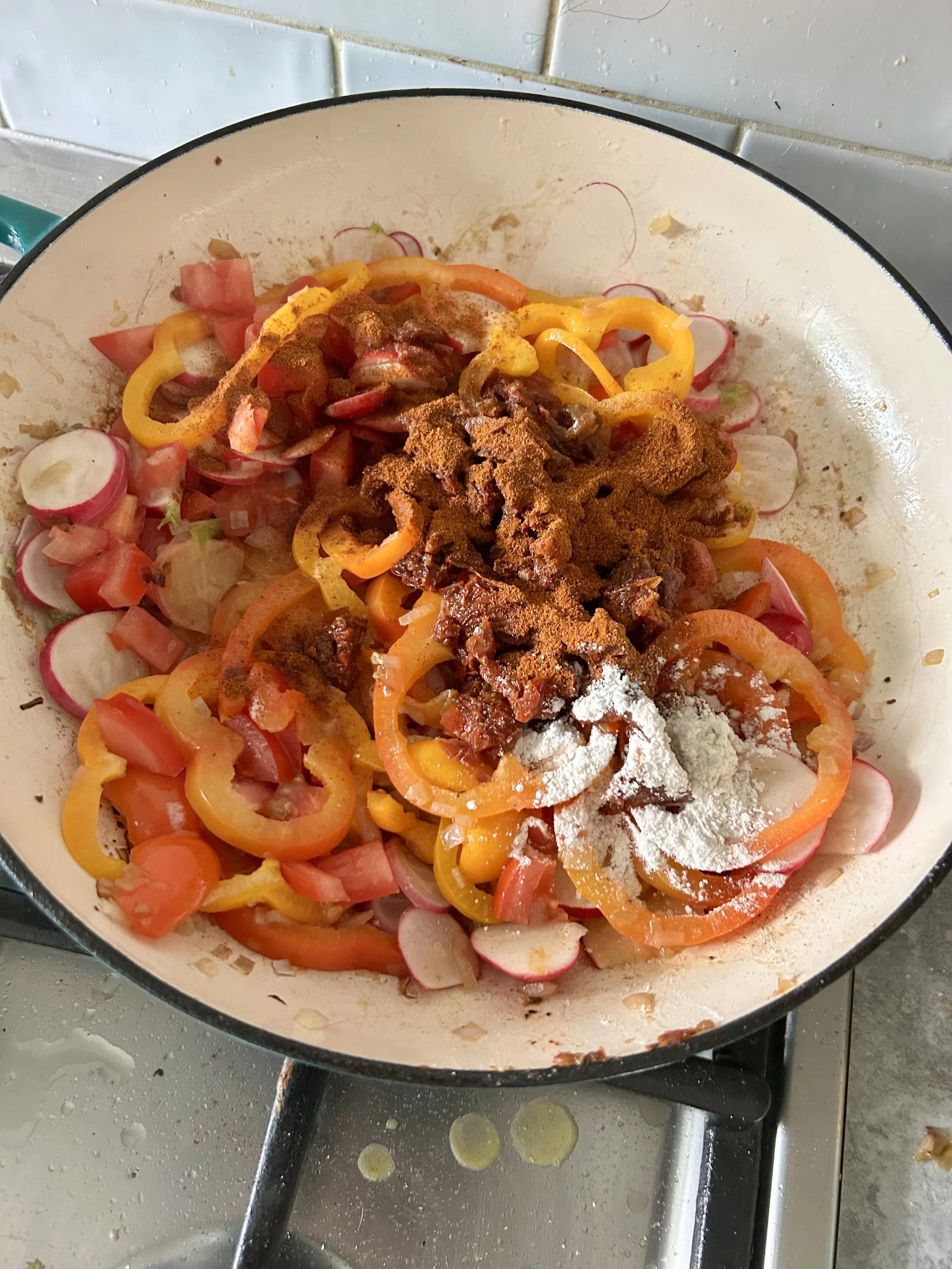 - Add the sliced peppers, the sliced radishes and sundried tomatoes to the pan and give it a good mix up.