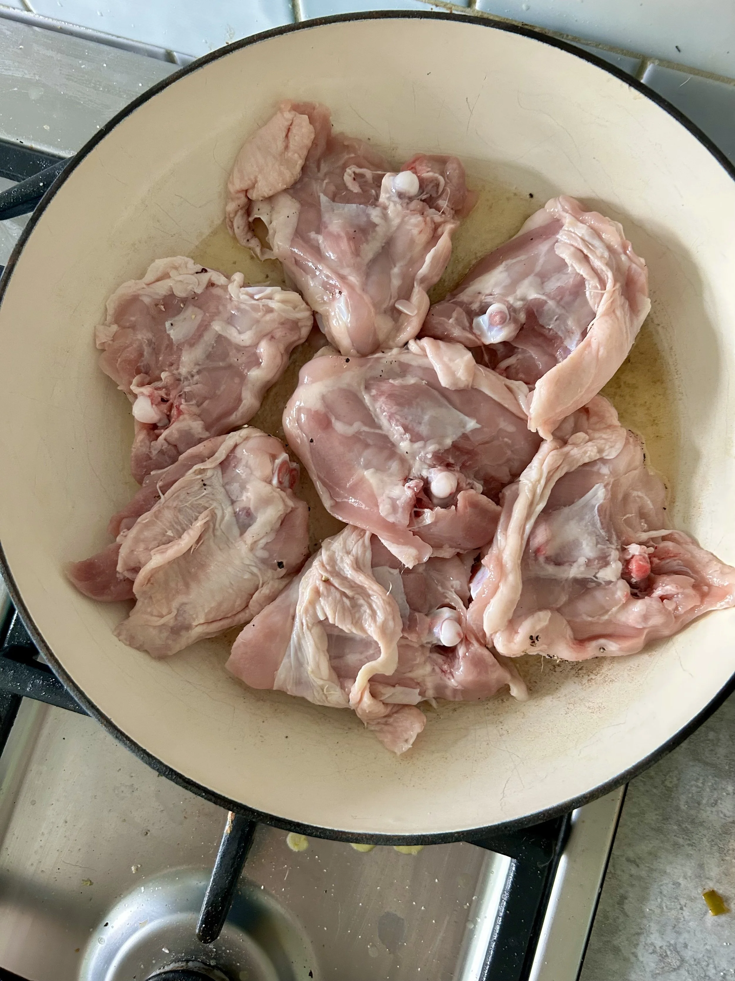 - Lay the chicken thighs in the hot oil, skin side down and let them cook on a medium heat until the skin is a golden brown and the fat under the skin is rendered out – Be Patient. This could take up to 15 minutes