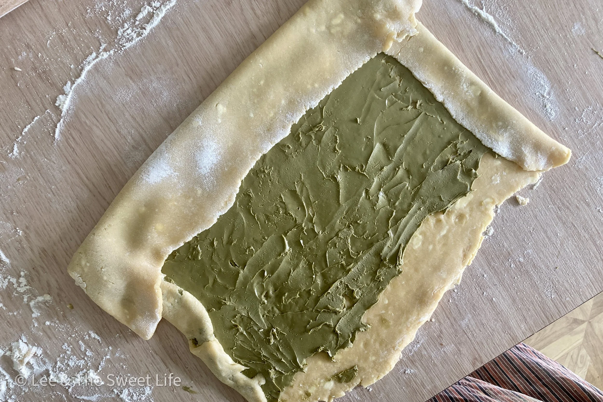 Very gently and generously, spread the pistachio cream all over the dough – See Tip Box