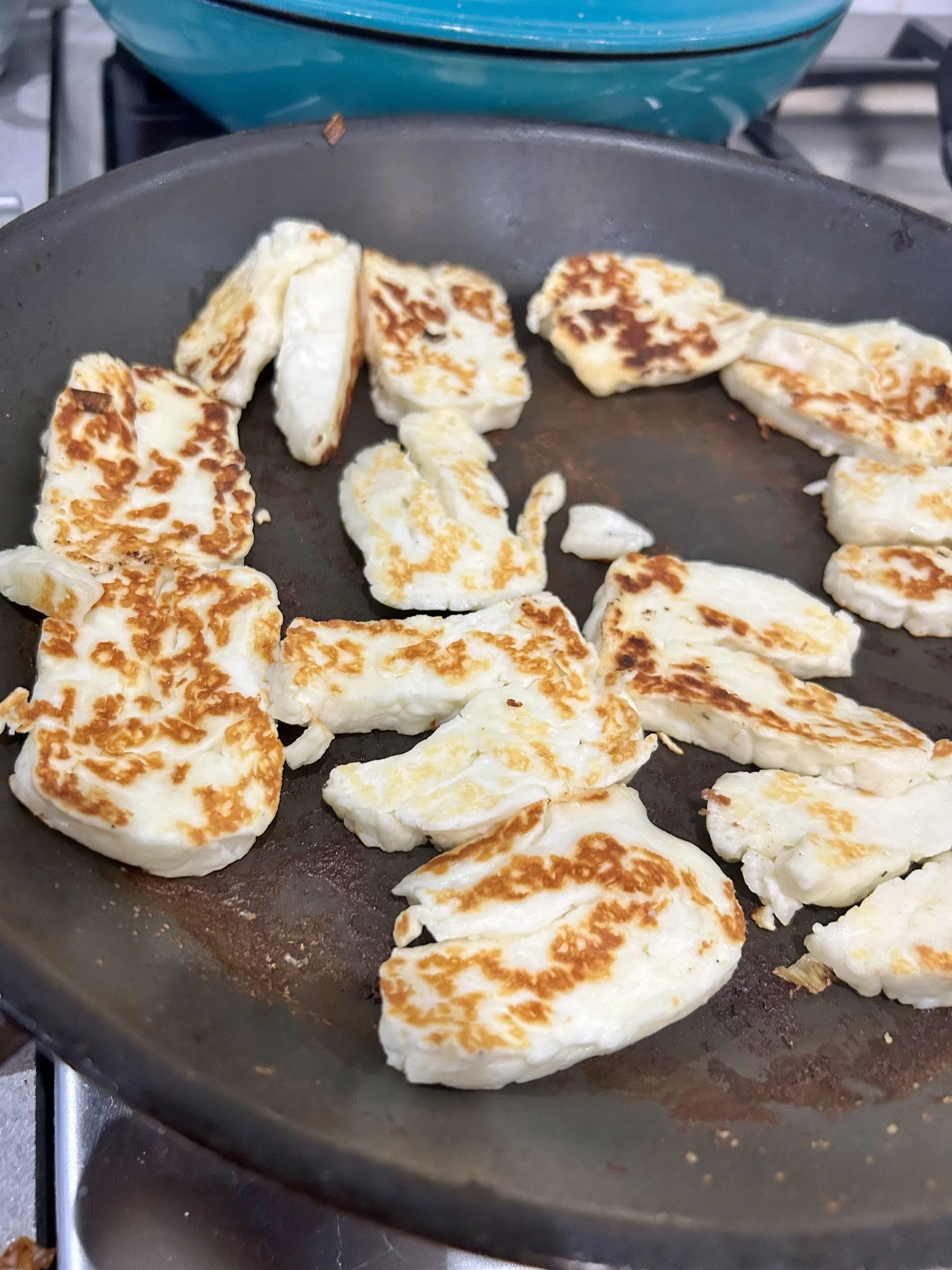 Heat up a clean frying pan on medium heat, and once hot place the slices of halloumi into the pan and cook until brown, turning over to brown the other side too.