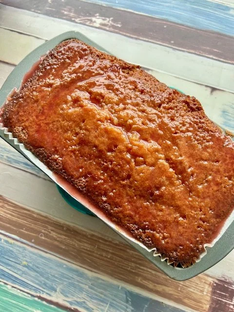 While the cake is still hot, use a tooth pick to poke holes all over the cake and spoon, very slowly, the liquid all over the top pf the cake, letting it slowly soak into the cake. – If you don’t want the cake to be ultra moist, don’t use all of the drizzle mixture.