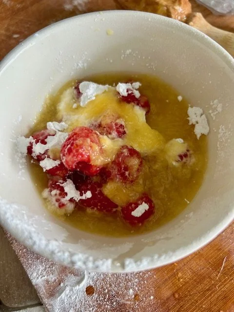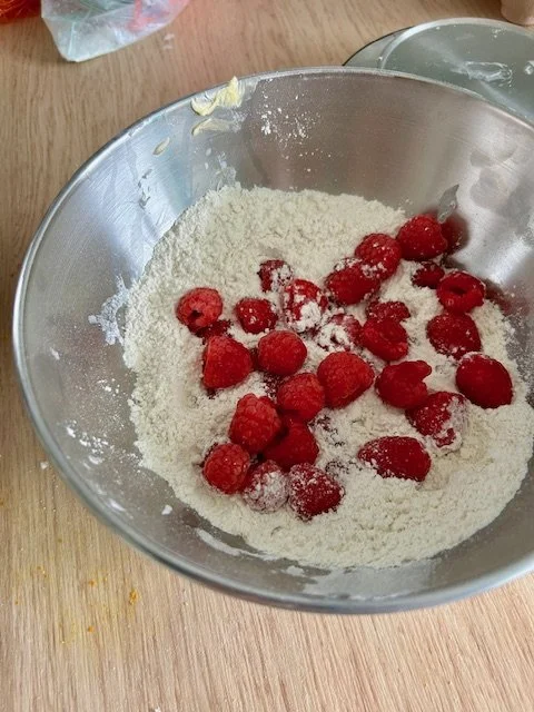 Gently coat the raspberries in flour to prevent them sinking