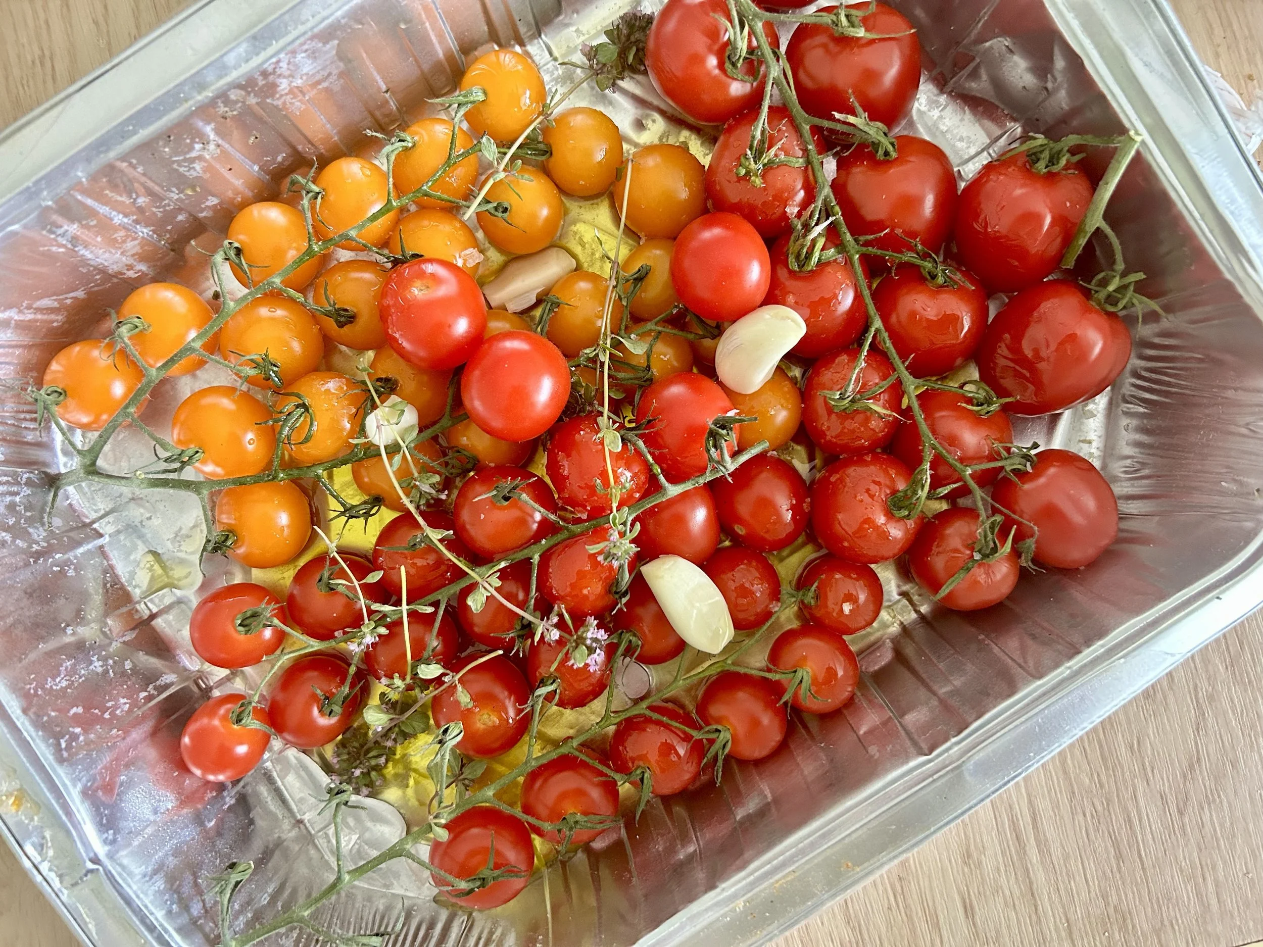 Tomatoes on the vine – Tomatoes on the vine are wonderful to use as they are full of flavour, but by no means are thy the only ones to use. If unable to get your hands in these, grab some multicolour cherry tomatoes.