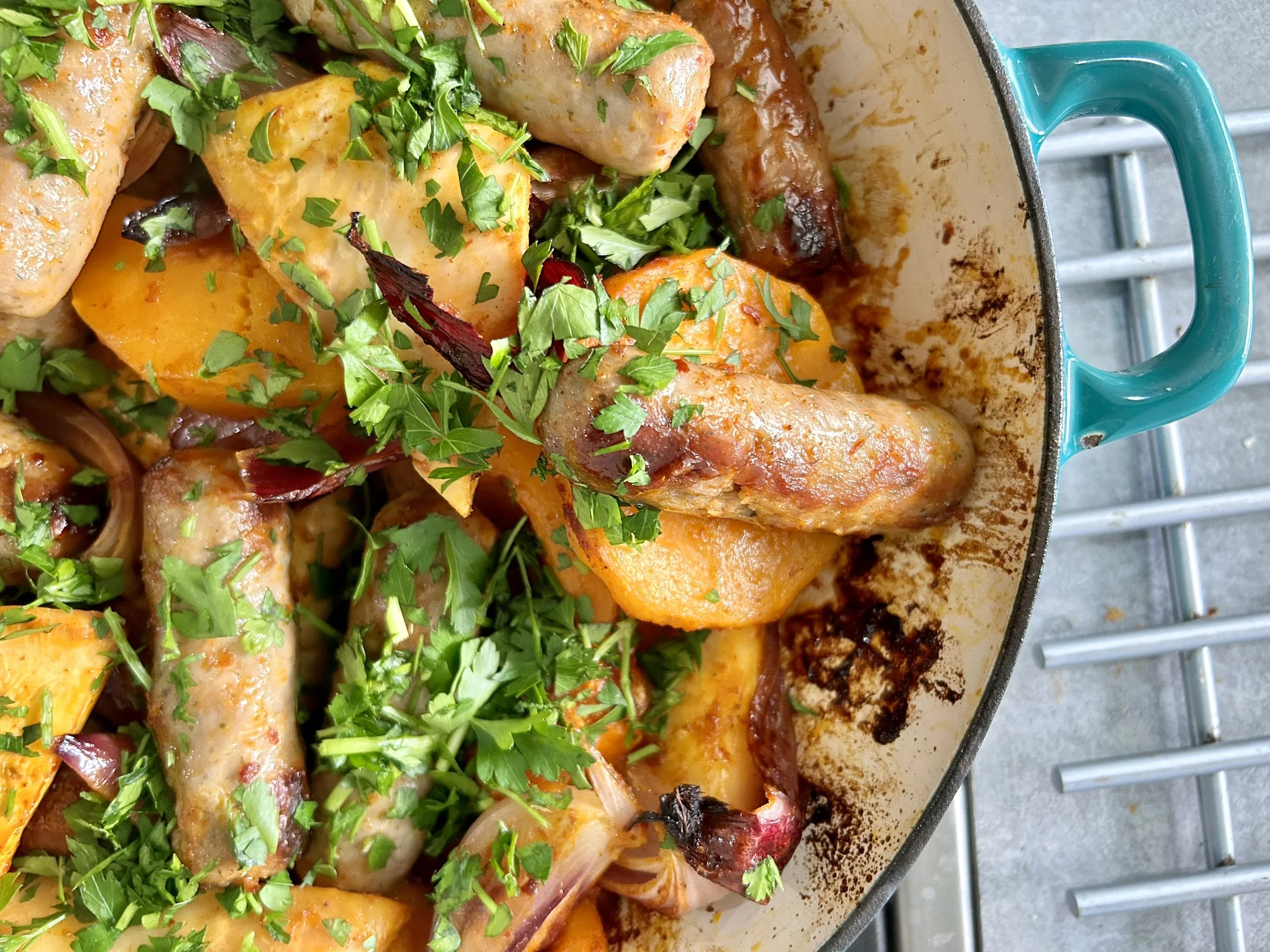 Smoky Sausage, Squash & Celeriac Bake