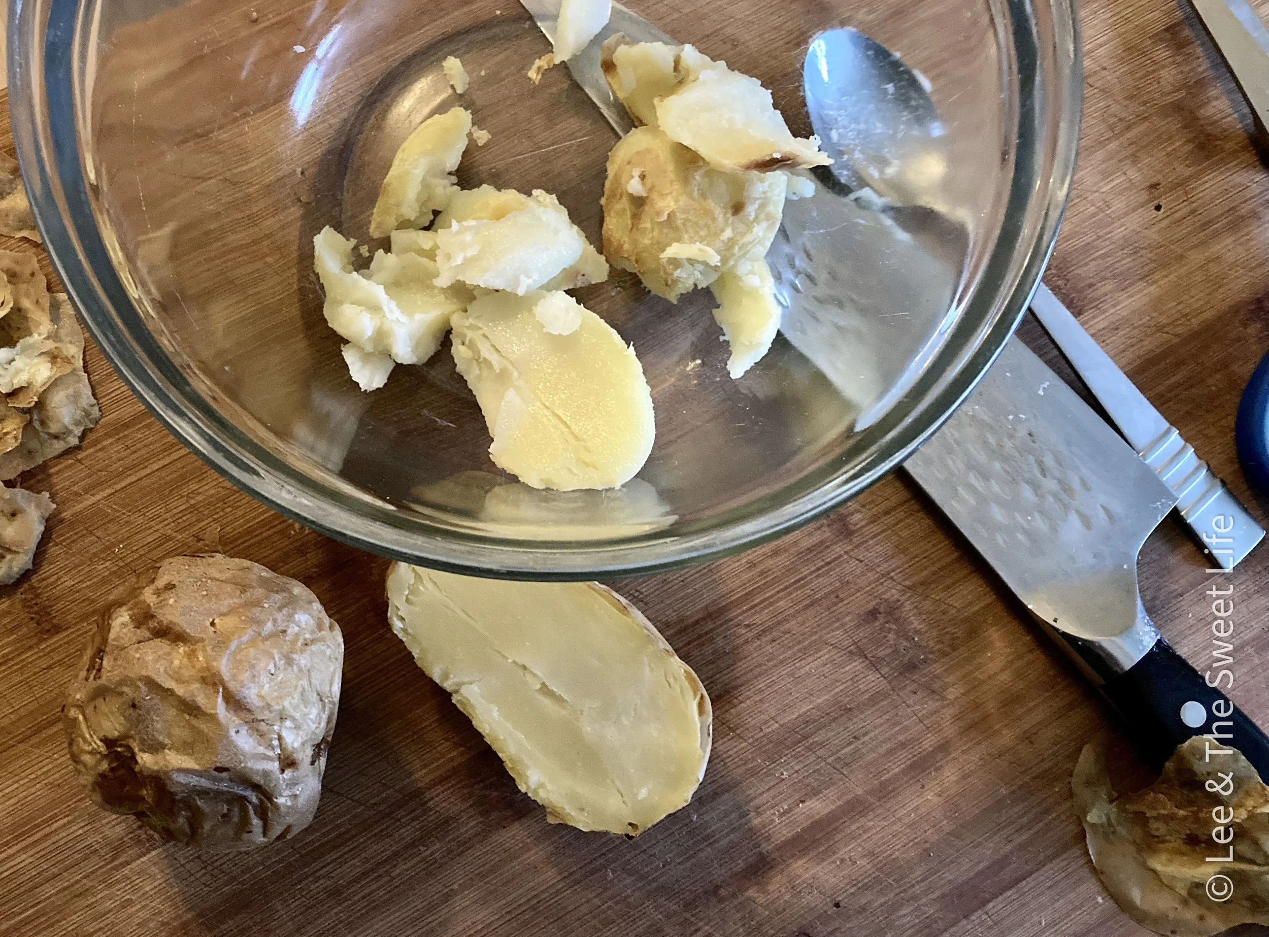 Scoop out the middle of the cold jacket potatoes into a bowl